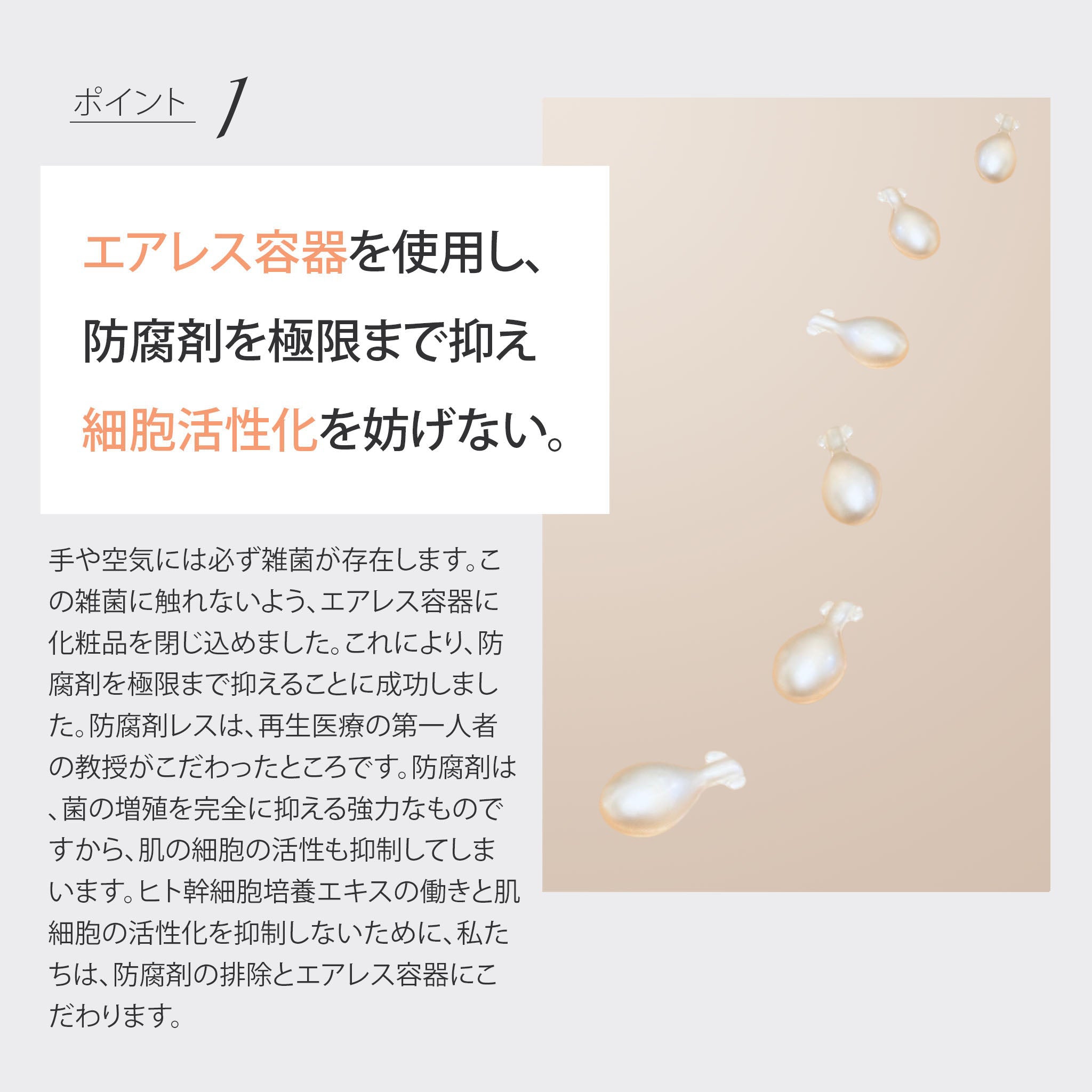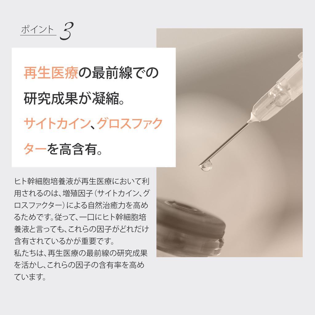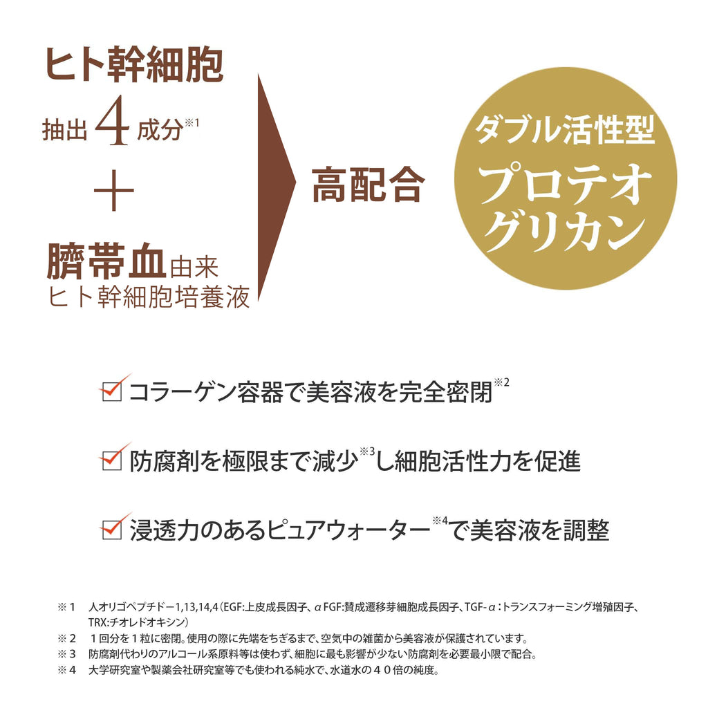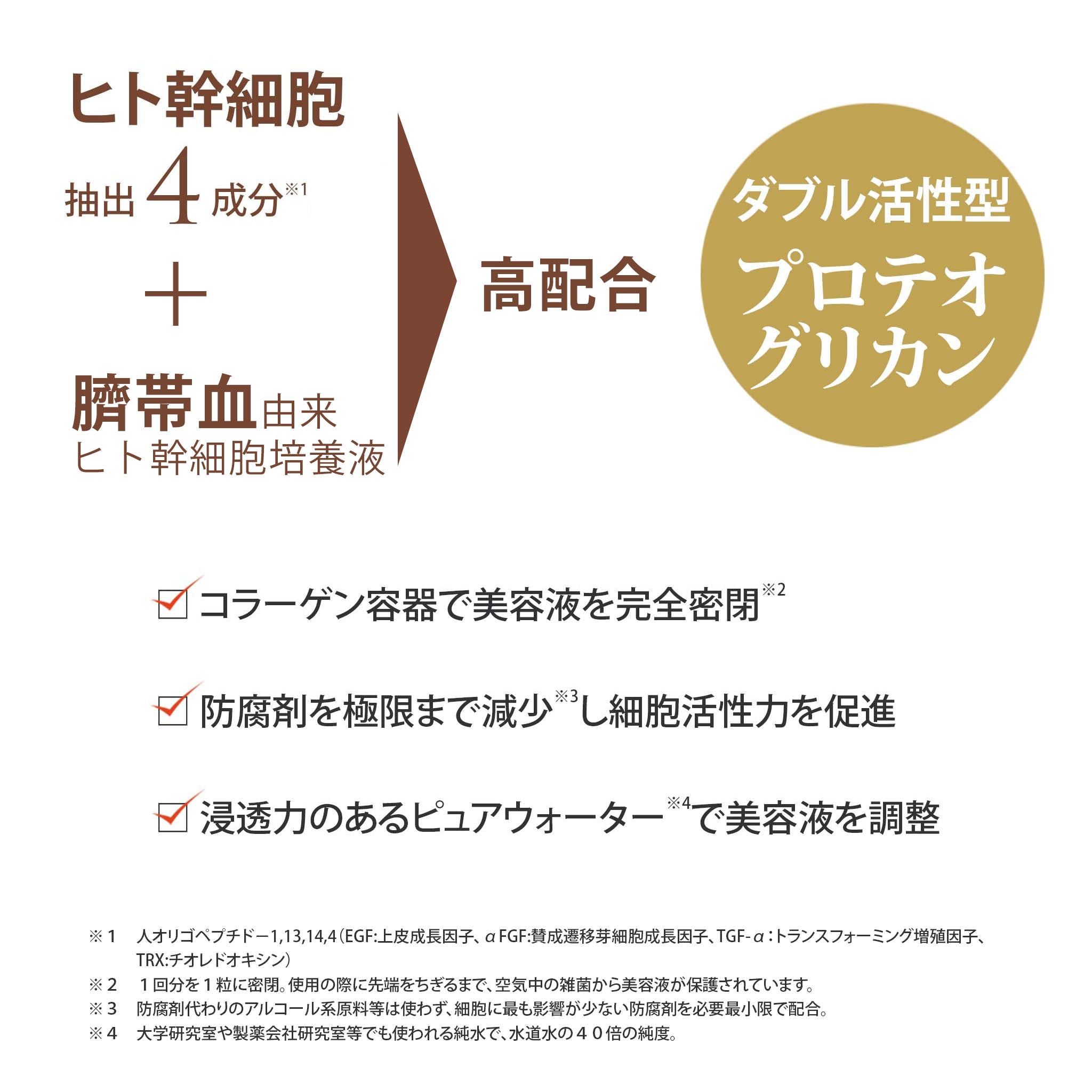 ※ヒトサイタイ血幹細胞順化培養液に加え、ヒト幹細胞培養液から特別に抽出した有効成分(ヒトオリゴペプチド-1・ヒトオリゴペプチド-13・ヒトオリゴペプチド-14・ヒトオリゴペプチド-4)を高濃度に配合。